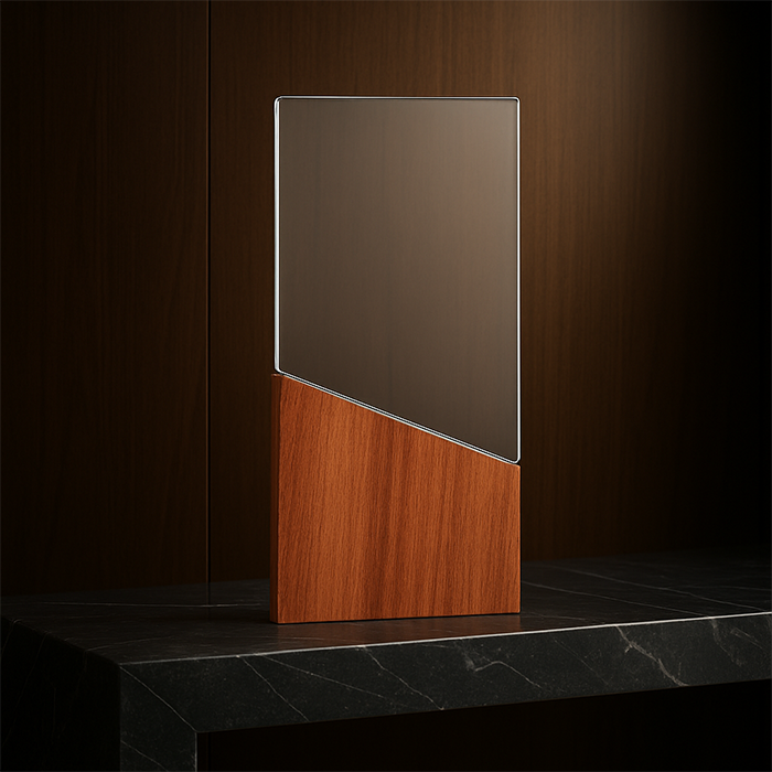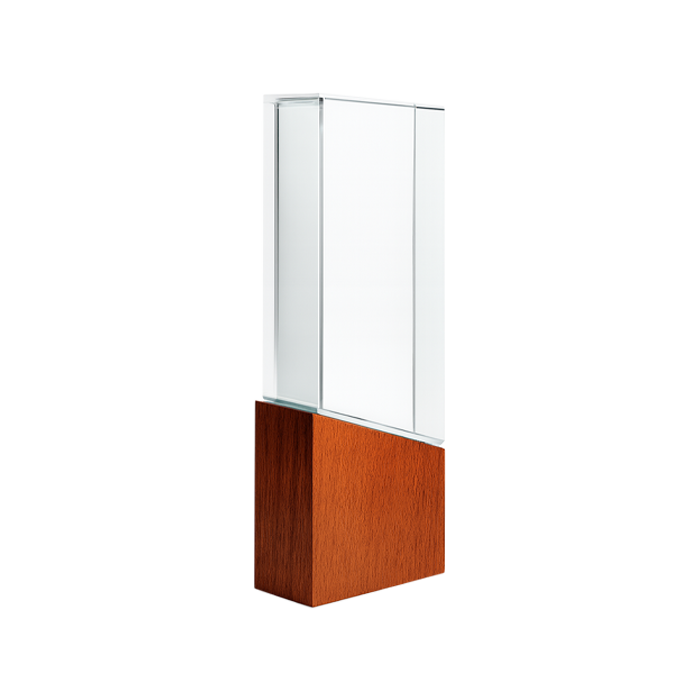 Reconocimiento de cristal con base de madera, diseño moderno y minimalista ideal para premiar logros corporativos con elegancia y estilo