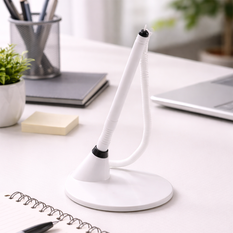 Bolígrafo plástico con soporte adhesivo y cadena extensible.