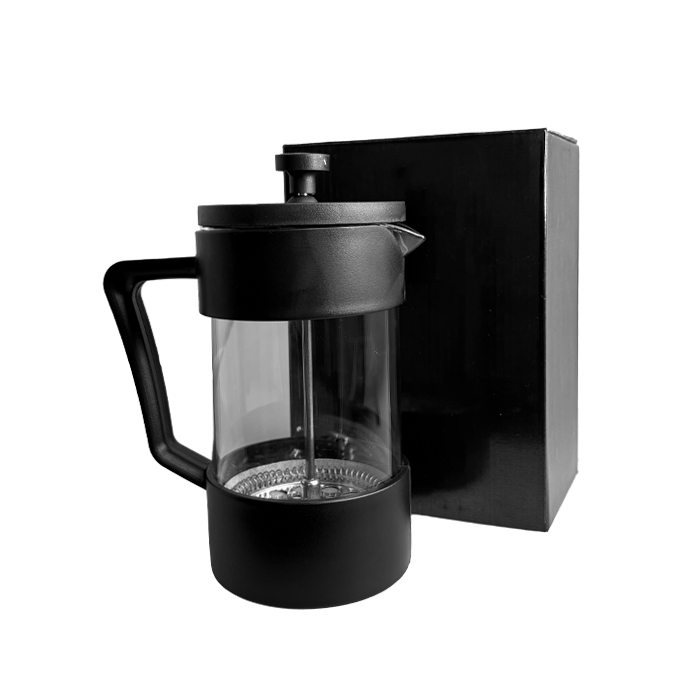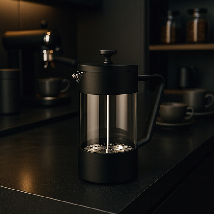 Prensa francesa moderna con cuerpo de vidrio y acabado negro mate. Ideal para preparar café fresco con estilo, perfecta para oficinas y espacios premium.