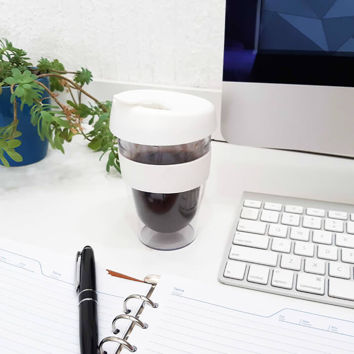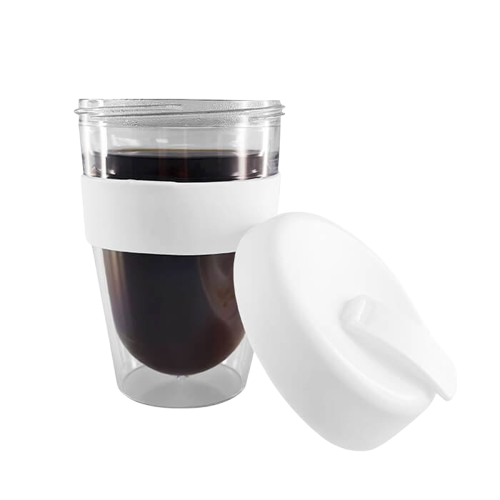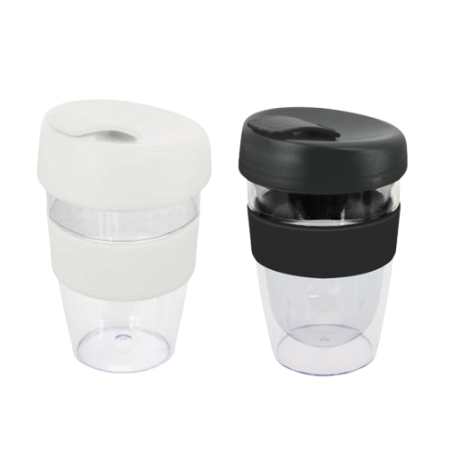 Tumbler, de acrílico transparente de doble pared aislante, con banda de silicón y tapa flip-top.