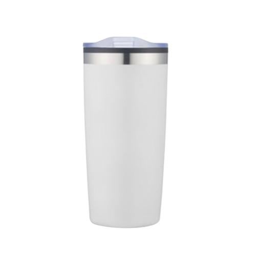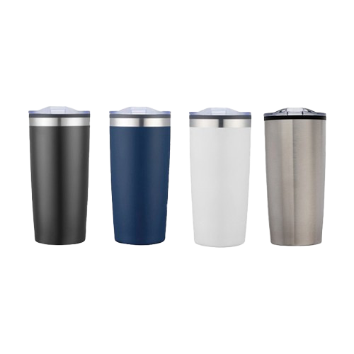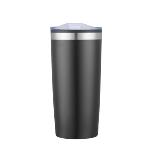 Tumbler con pared exterior de acero inoxidable y pared interior de plástico, tapa de acrílico con sistema de apertura y cierre.