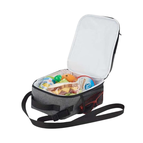 Lonchera de poliéster con interior plastificado, bolsillo frontal, bolsa de red lateral y correa ajustable.
