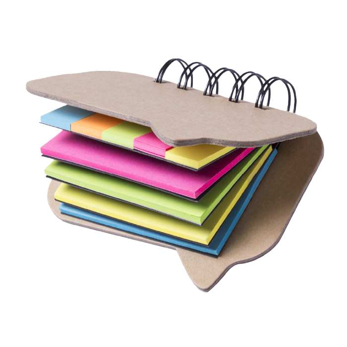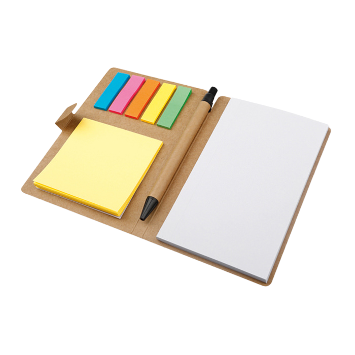 Libreta ecológica con 5 banderines de colores, bolígrafo y post it.