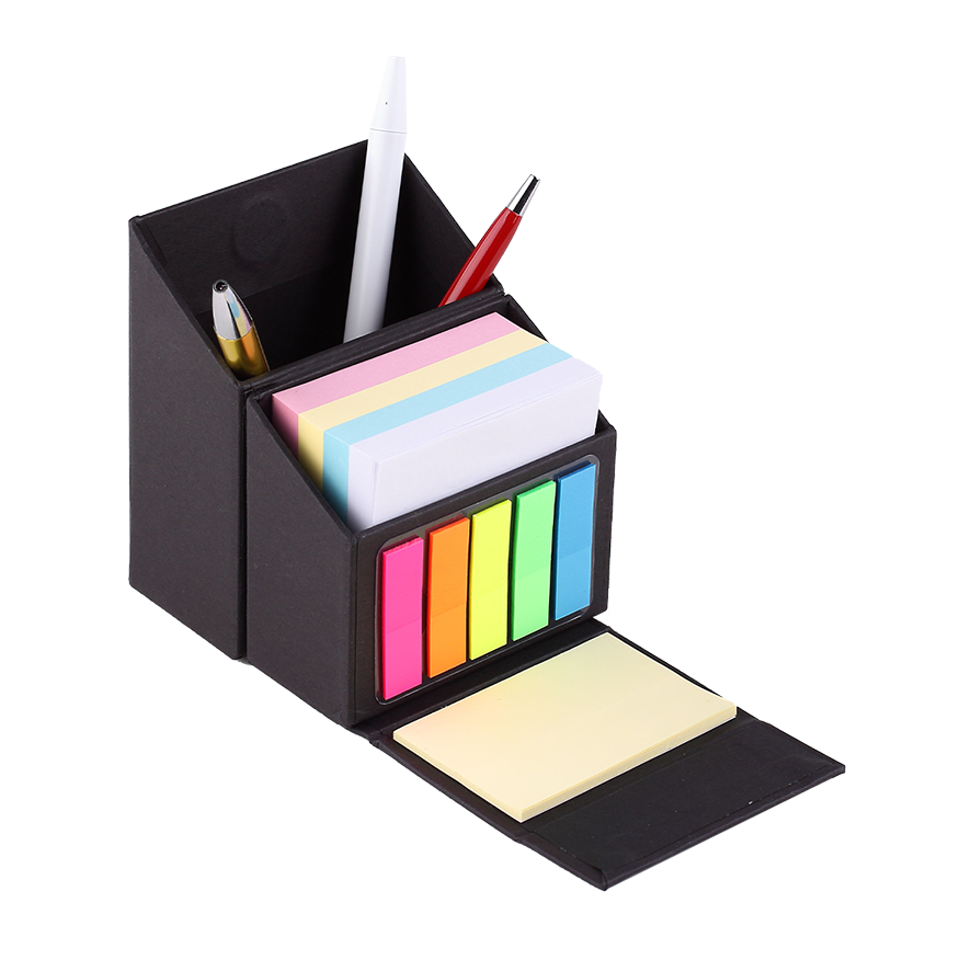 Porta notas. Incluye 5 banderines de colores, post it rectangular y taco de notas.
