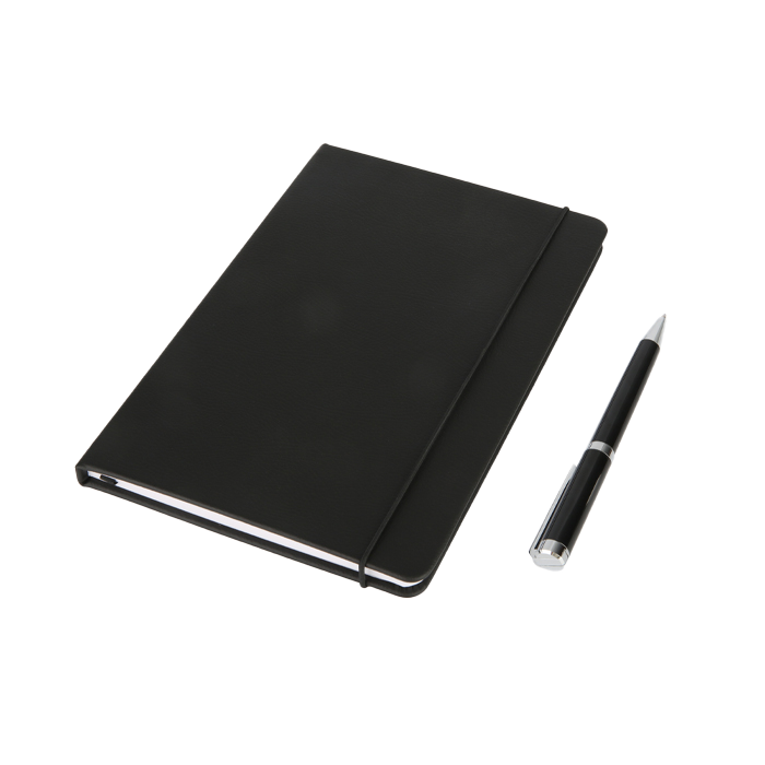 Set de libreta y bolígrafo en material curpiel. Suministrado en caja de regalo.