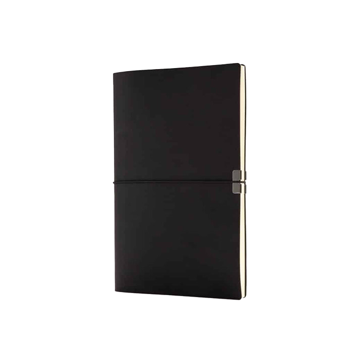Libreta con tapa flexible y acabado soft-touch. Broche metálico y elástico para cierre.