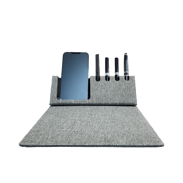 Mousepad de poliester multifuncional con soporte triangular para boligrafos y dispositivos moviles