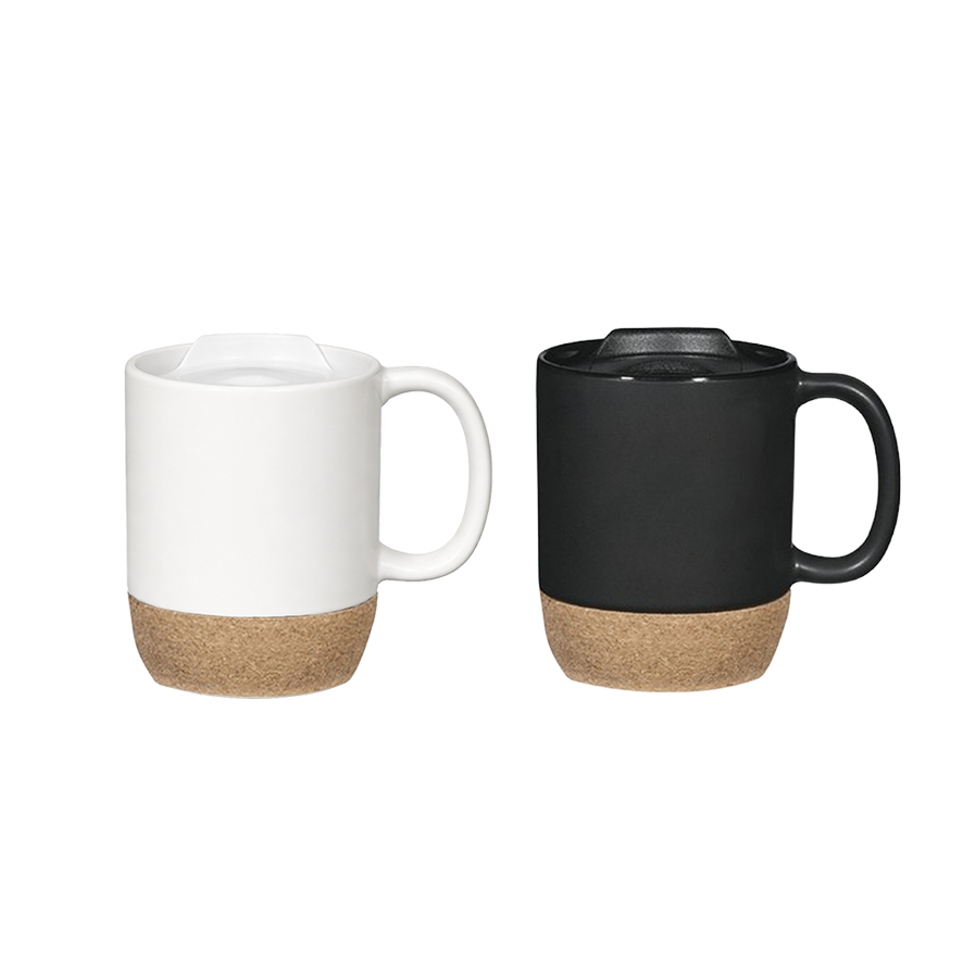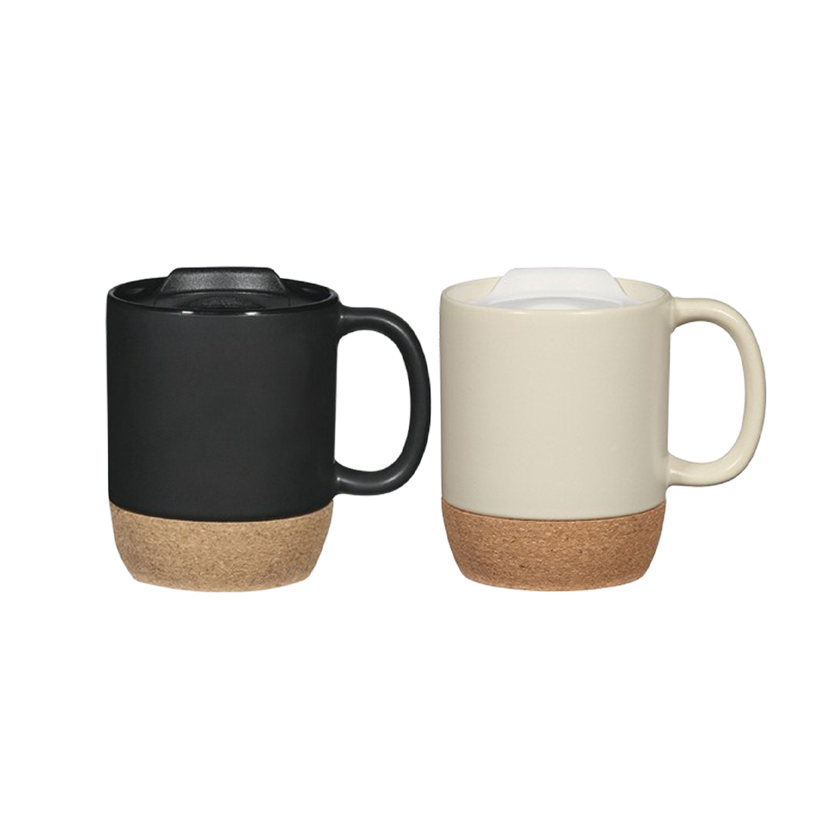 Taza de cerámica con acabado mate, base de corcho antideslizante, tapa con sistema de apertura y cierre.