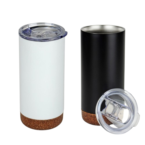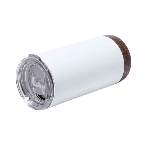 Tumbler de acero inoxidable de doble pared aislante con base de corcho antideslizante y tapa de acrílico con sistema de apertura y cierre.