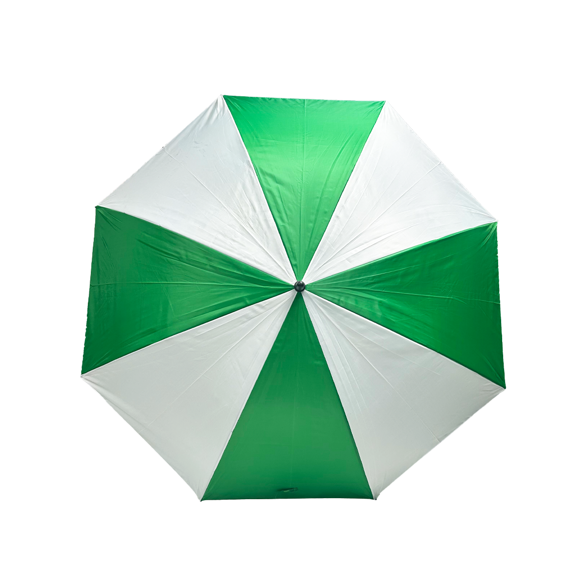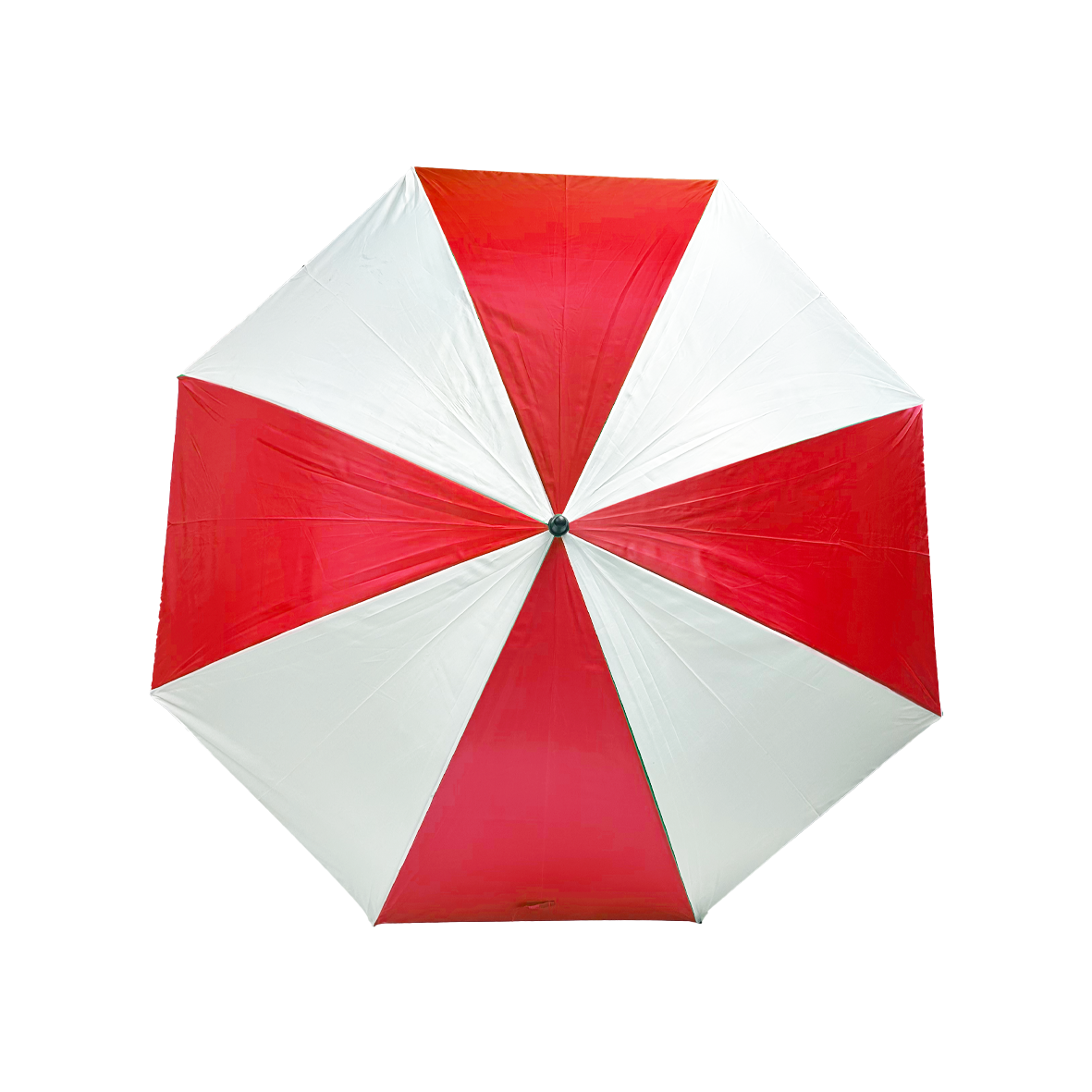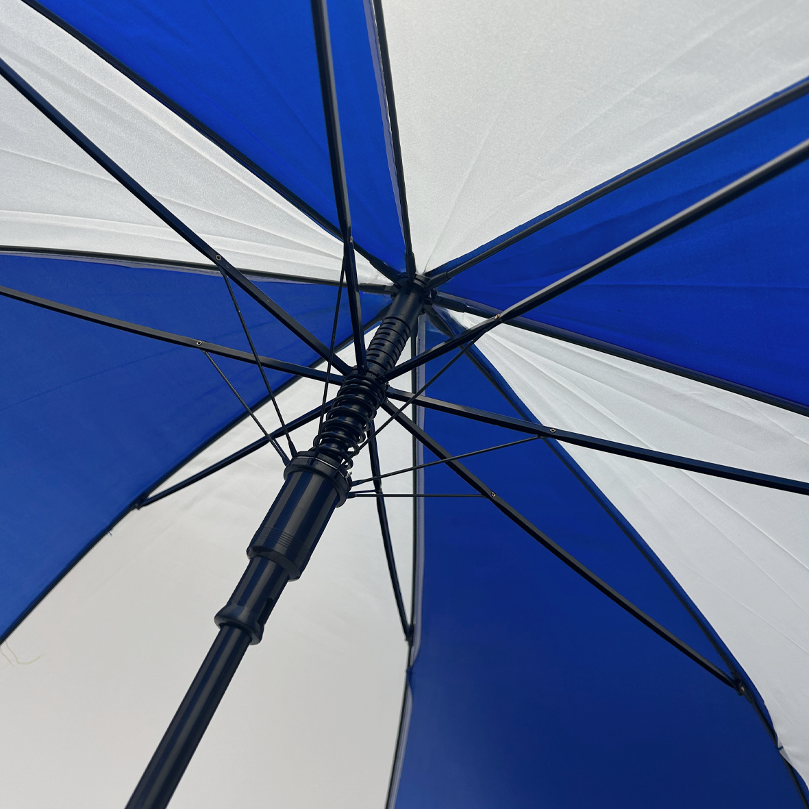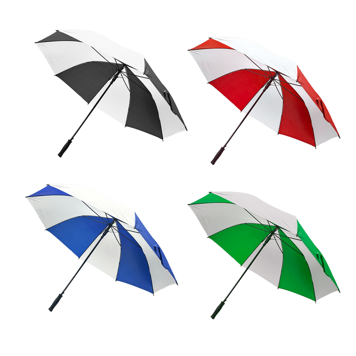 Paraguas de poliester bicolor, con boton pulsador mecanico.