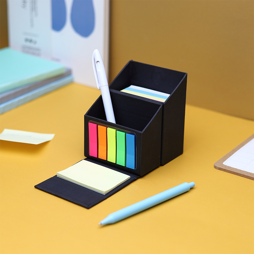 Porta notas. Incluye 5 banderines de colores, post it rectangular y taco de notas.