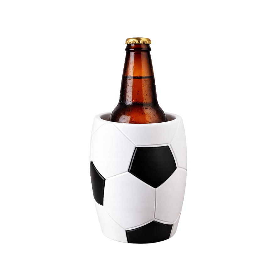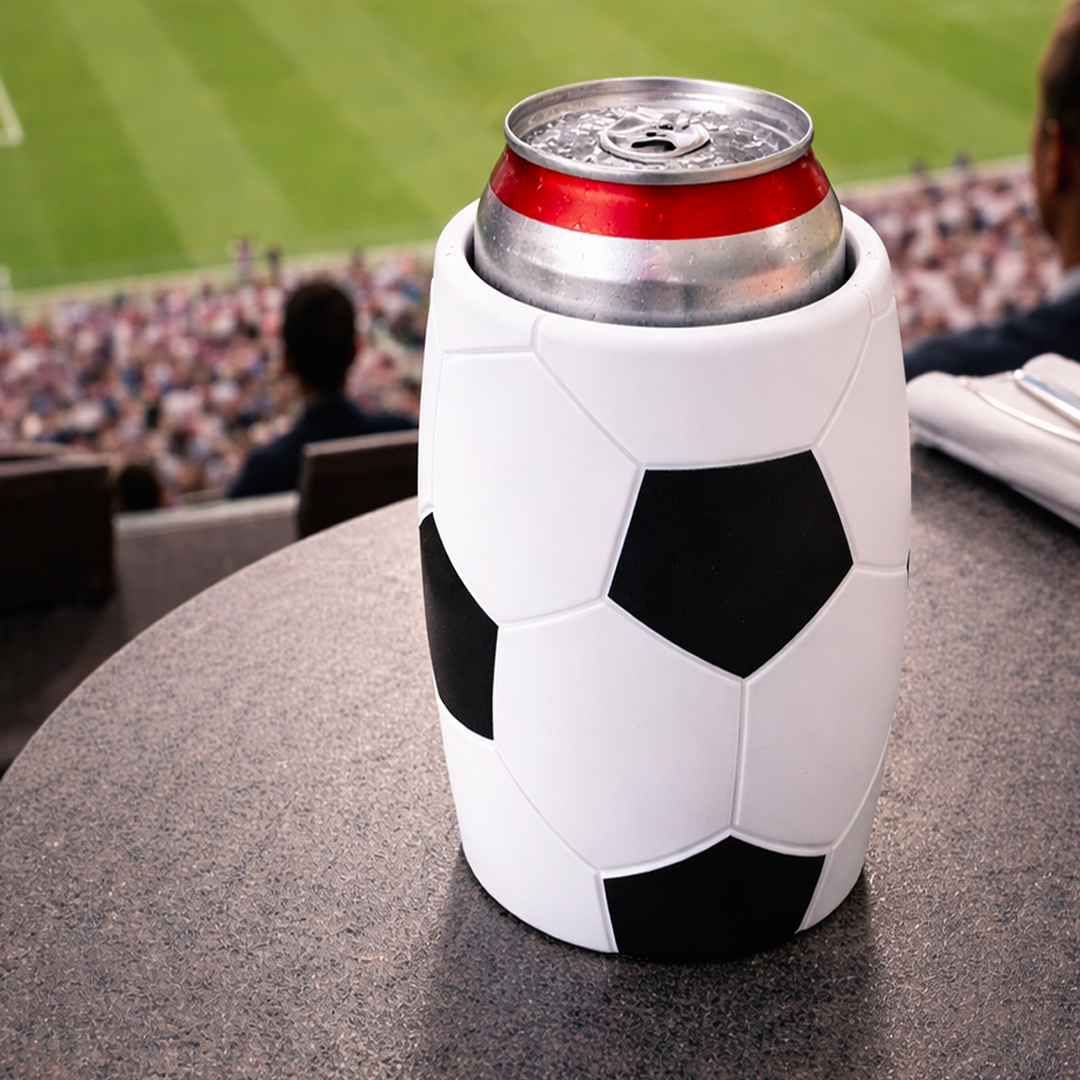 Koozie en forma de balón de fútbol fabricado en material aislante que ayuda a mantener la bebida fría por más tiempo.