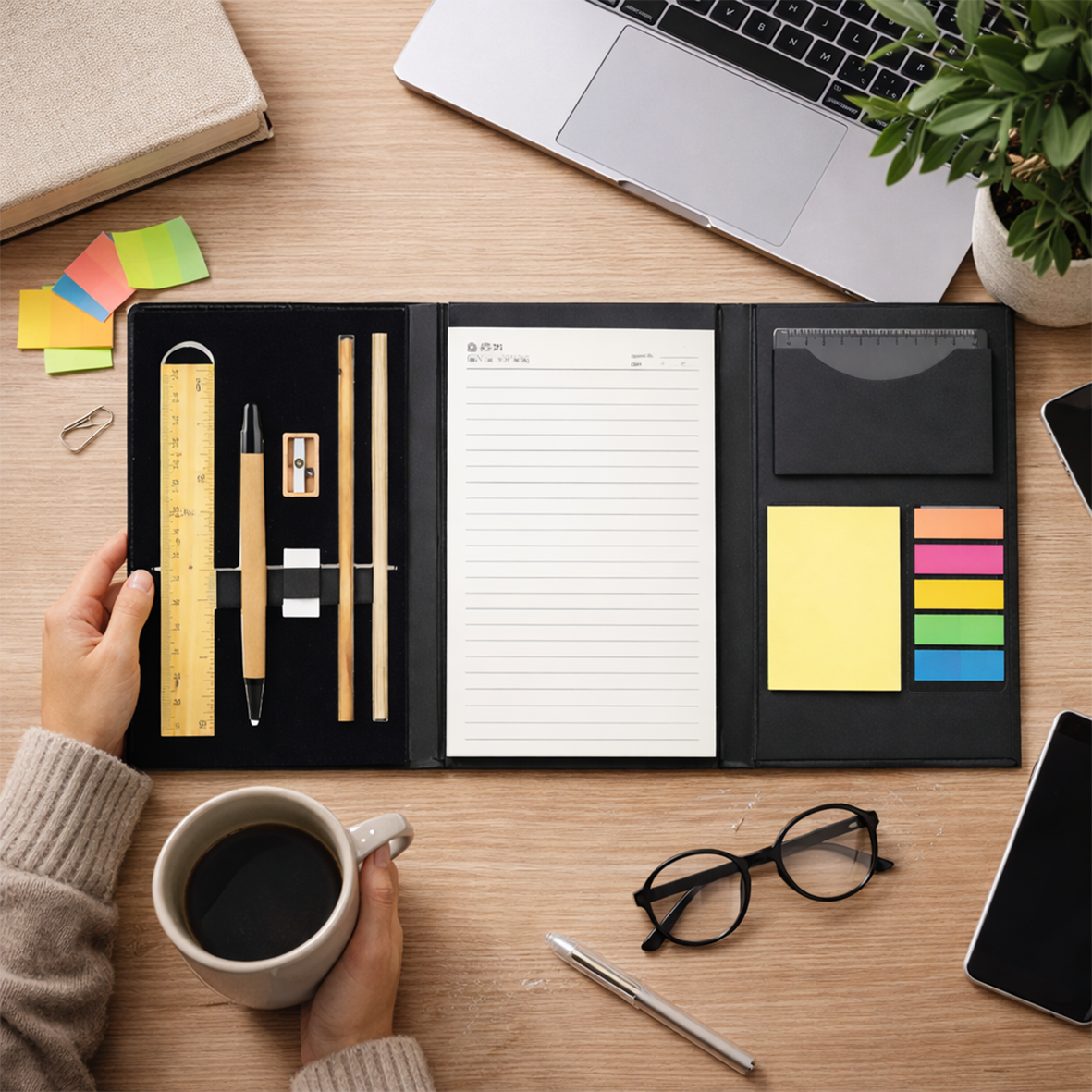 Portafolio organizador de escritorio que incluye libreta, regla, bolígrafo, lápices y notas adhesivas de colores.