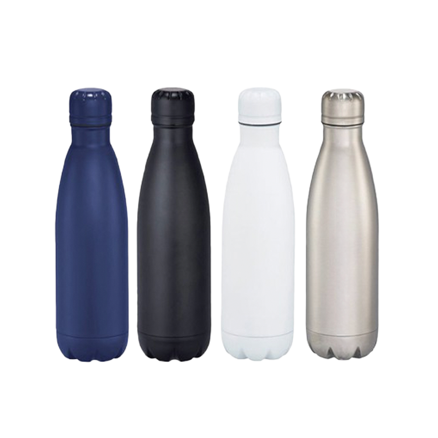 Botella de acero inoxidable con acabado en color sólido, doble pared aislante y tapa de rosca hermética.