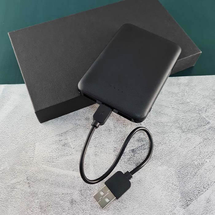 Batería portátil compacto con indicador led y salida USB dual. Capacidad de 5000 mAh.