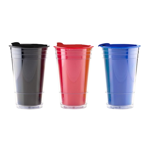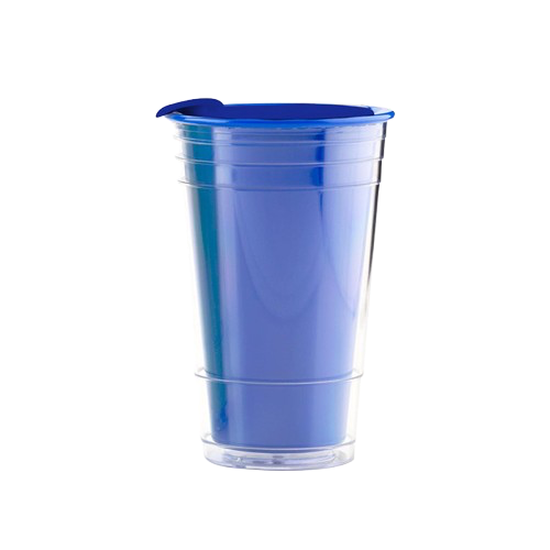 Vaso tipo tumbler con pared exterior de acrílico y pared interior de plástico, tapa con sistema de apertura y cierre