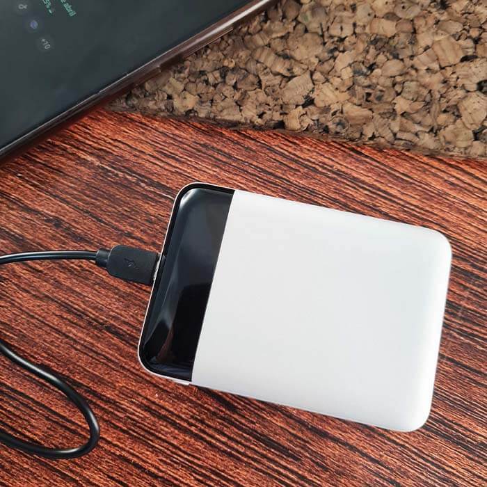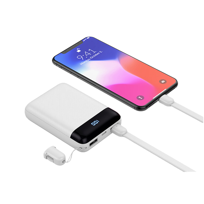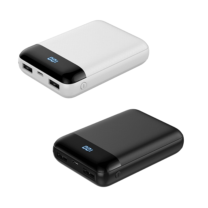 Batería portátil compacto con indicador digital y salida USB dual. Capacidad de 10000 mAh.