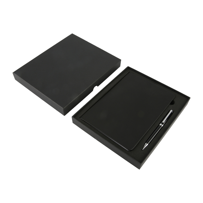 Set de libreta y bolígrafo en material curpiel. Suministrado en caja de regalo.