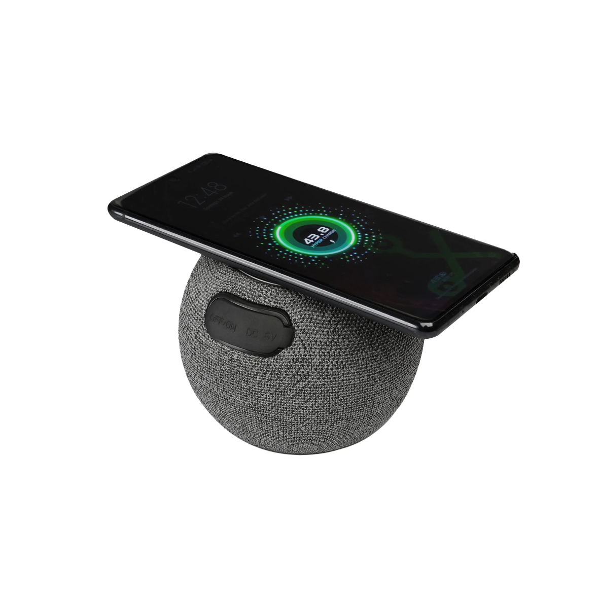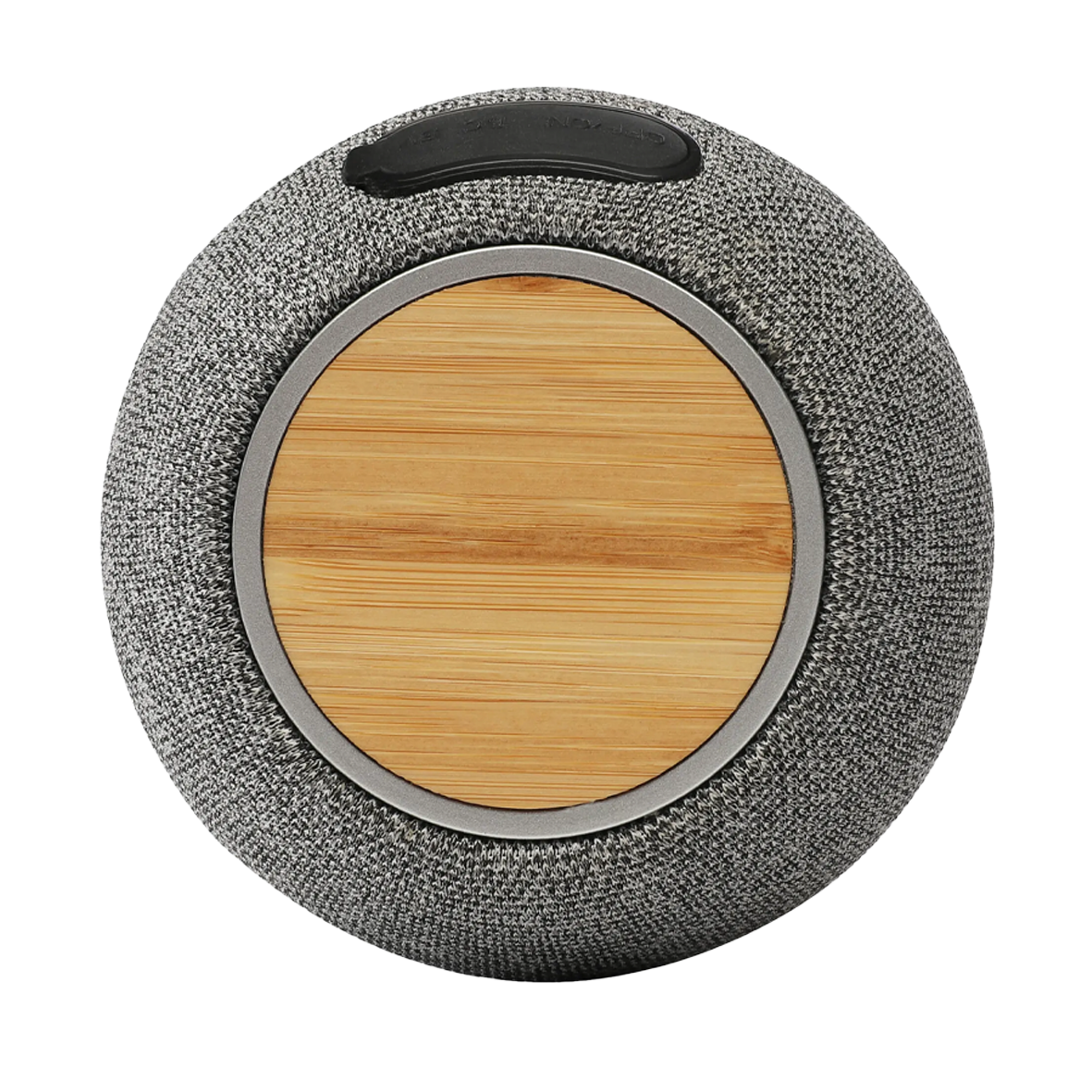 Altavoz bluetooth de poliester con cargador de bambu, para dispositivos móviles con tecnología Wireless Qi.
