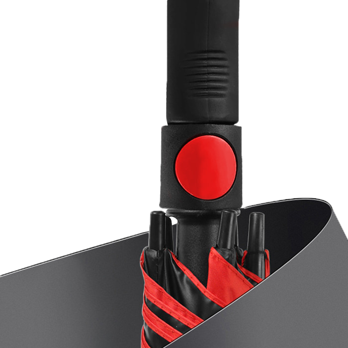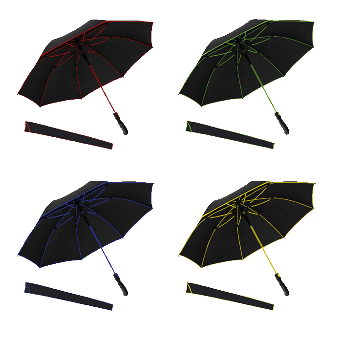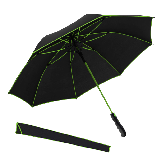 Paraguas de tela pongee, mango premium ergonómico, marco y cierre de correas, varillas decolores sólidos y apertura automática. Incluye funda de color.