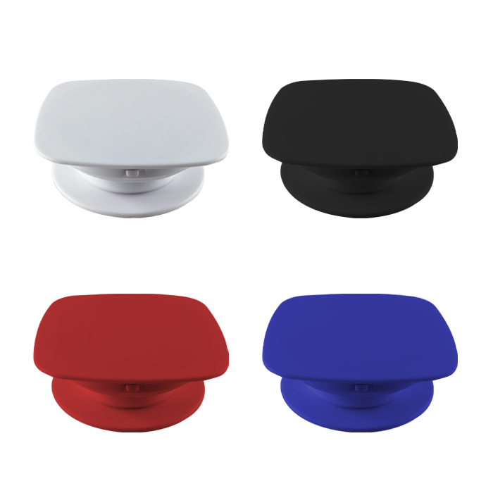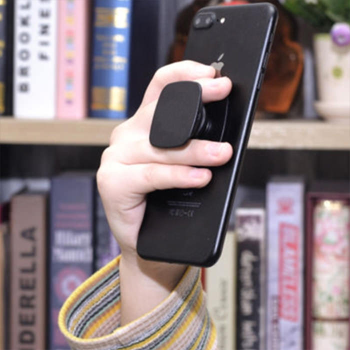 Sujetador tipo pop-socket cuadrado para dispositivo móvil.