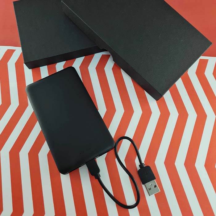 Batería portátil slim con indicador led y salida USB dual. Capacidad de 4000 mAh.