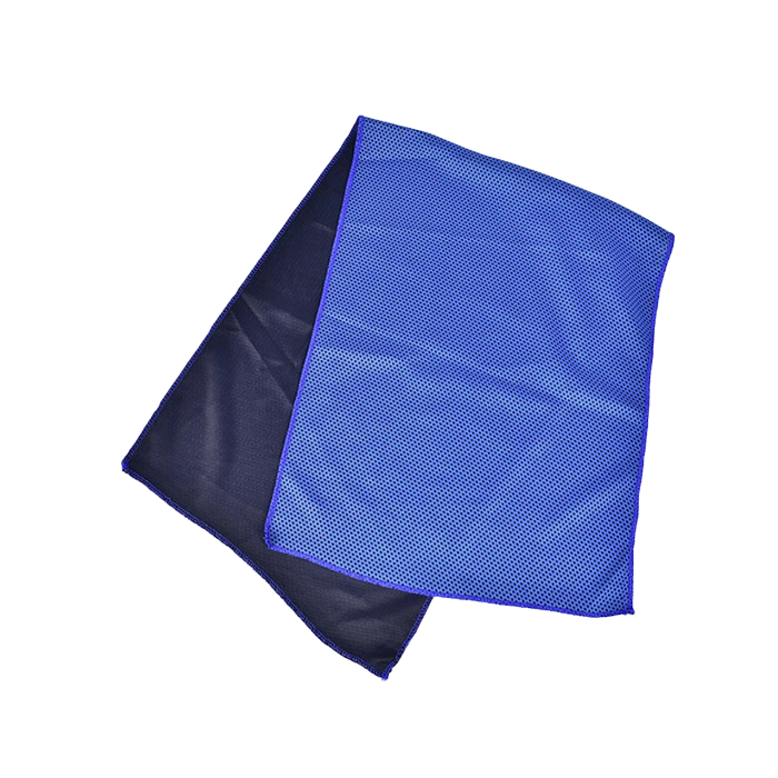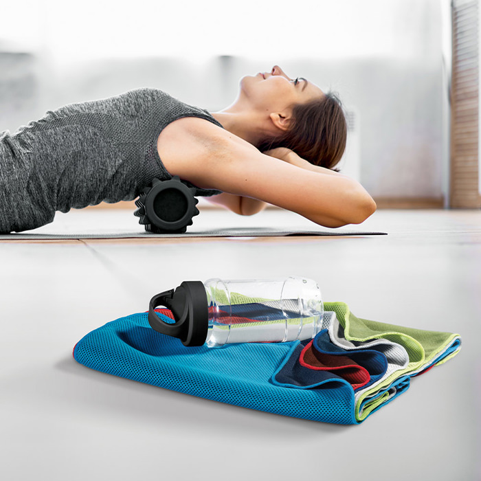 Toalla deportiva de microfibra. Incluye bote plástico con sujetador.