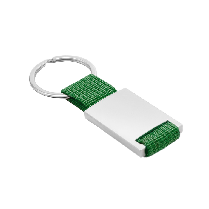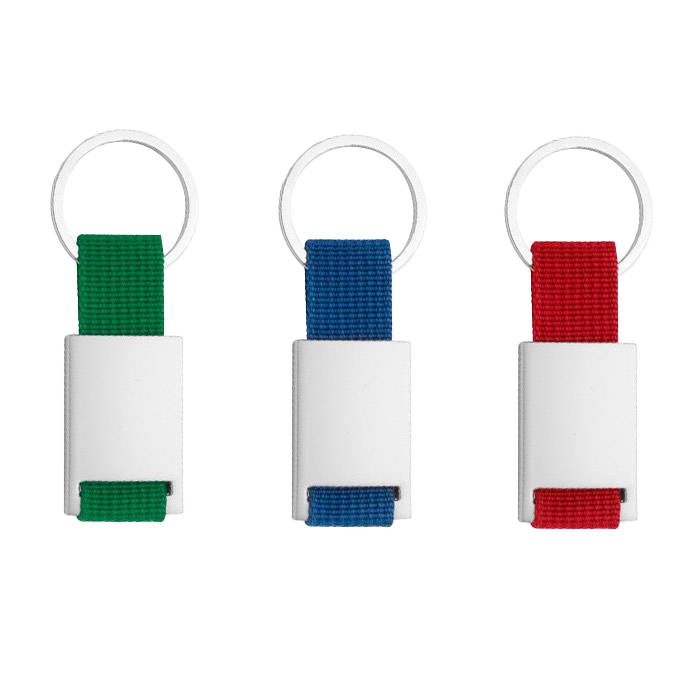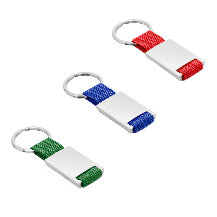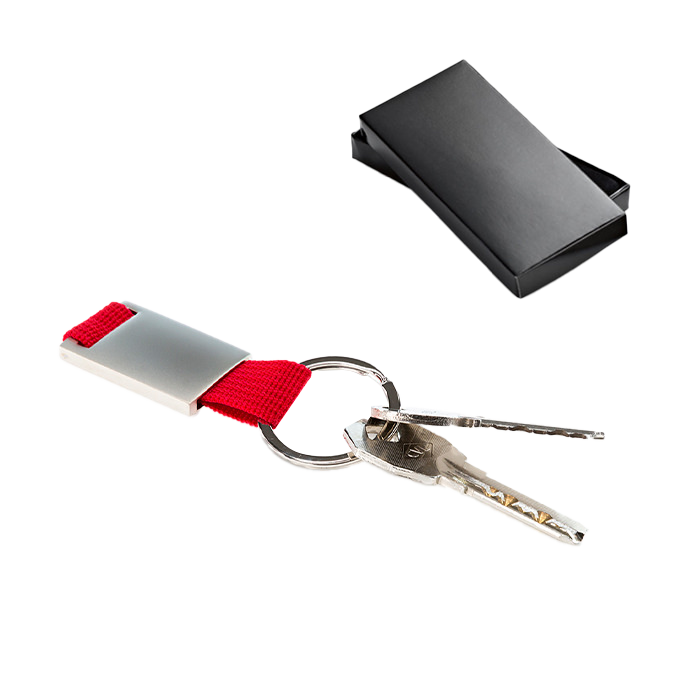 Llavero metálico con cincho de tela. Suministrado en caja de regalo.