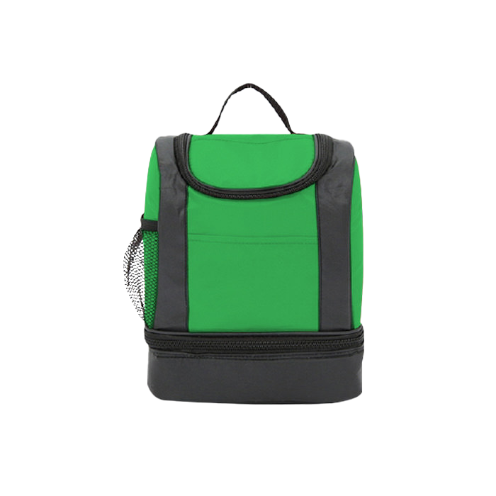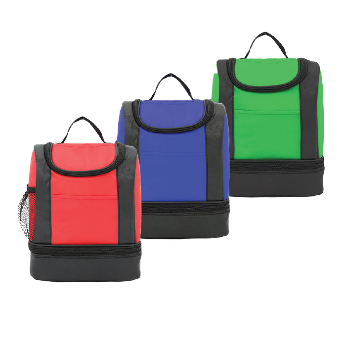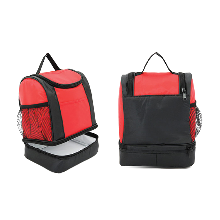 Lonchera con interior plastificado, doble compartimento, superior e inferior. Incluye bolsa lateral de red.