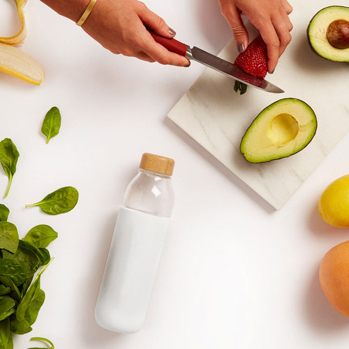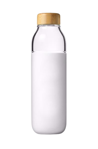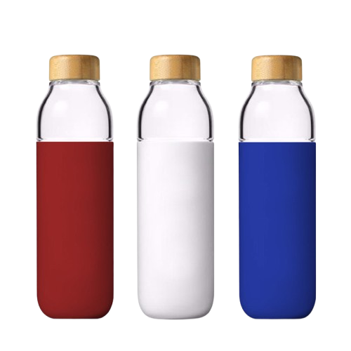 Botella de vidrio transparente y resistente, con tapa de bambú y funda de silicón.