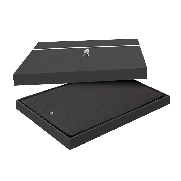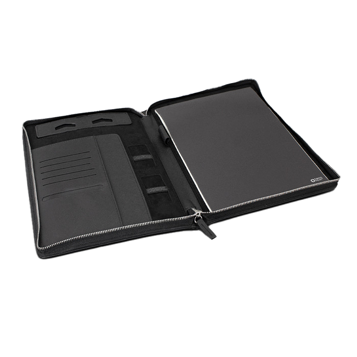 Portafolio A4 con bolsillos internos, porta tarjetas, bloc de notas y cierre de cremallera.  Suministrado en caja de regalo.