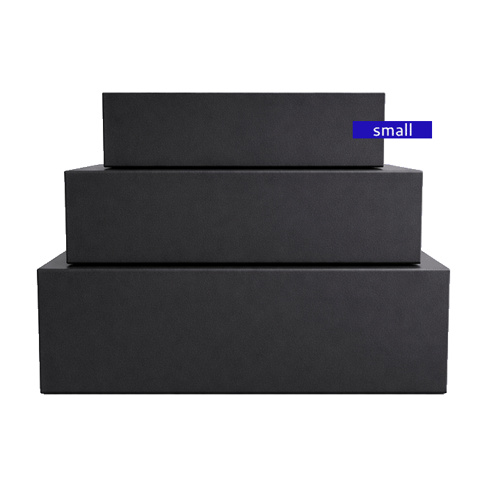 Caja rígida premium con tapa imantada, elaborada en cartón de alta resistencia con acabado negro elegante.