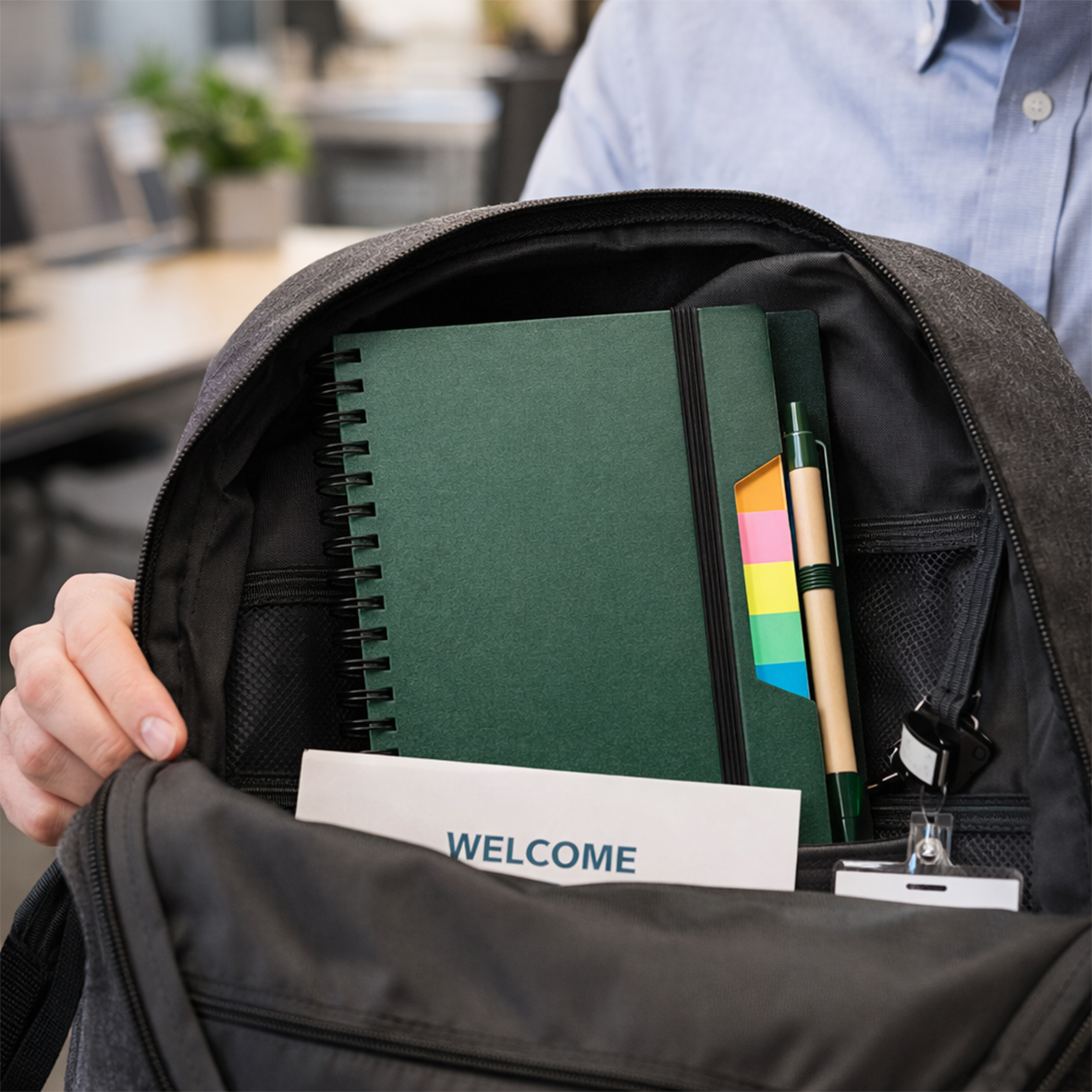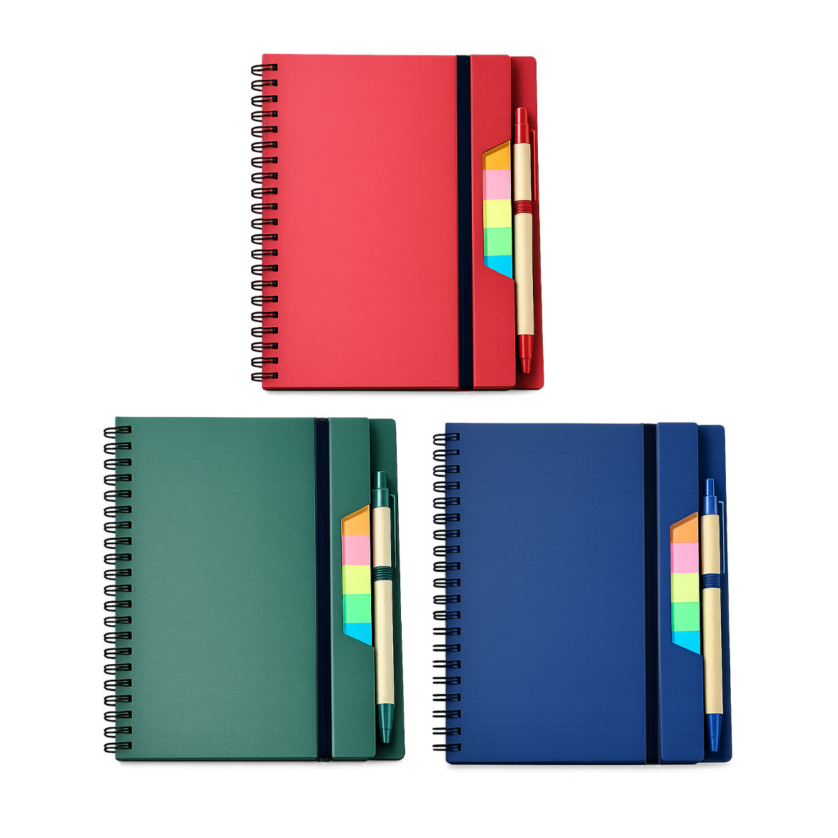 Cuaderno ecológico con espiral, notas adhesivas y bolígrafo.
