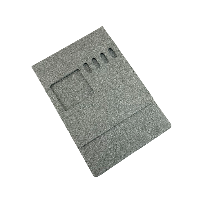 Mousepad de poliester multifuncional con soporte triangular para boligrafos y dispositivos móviles.
