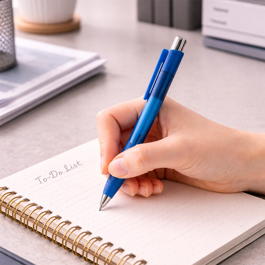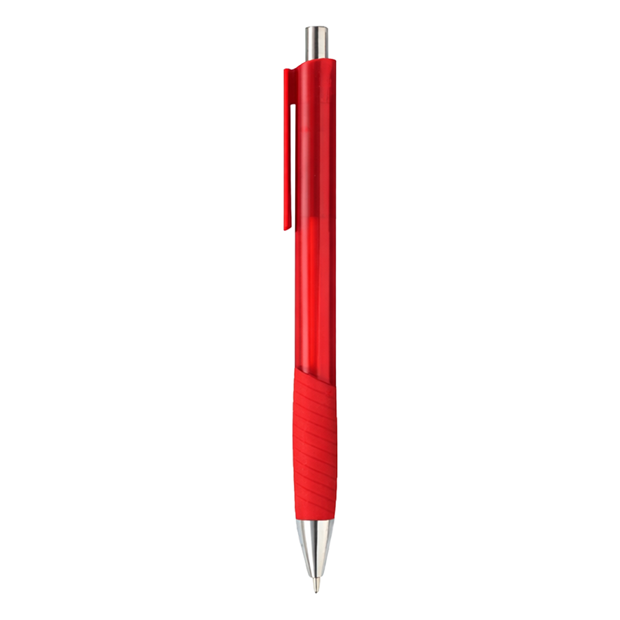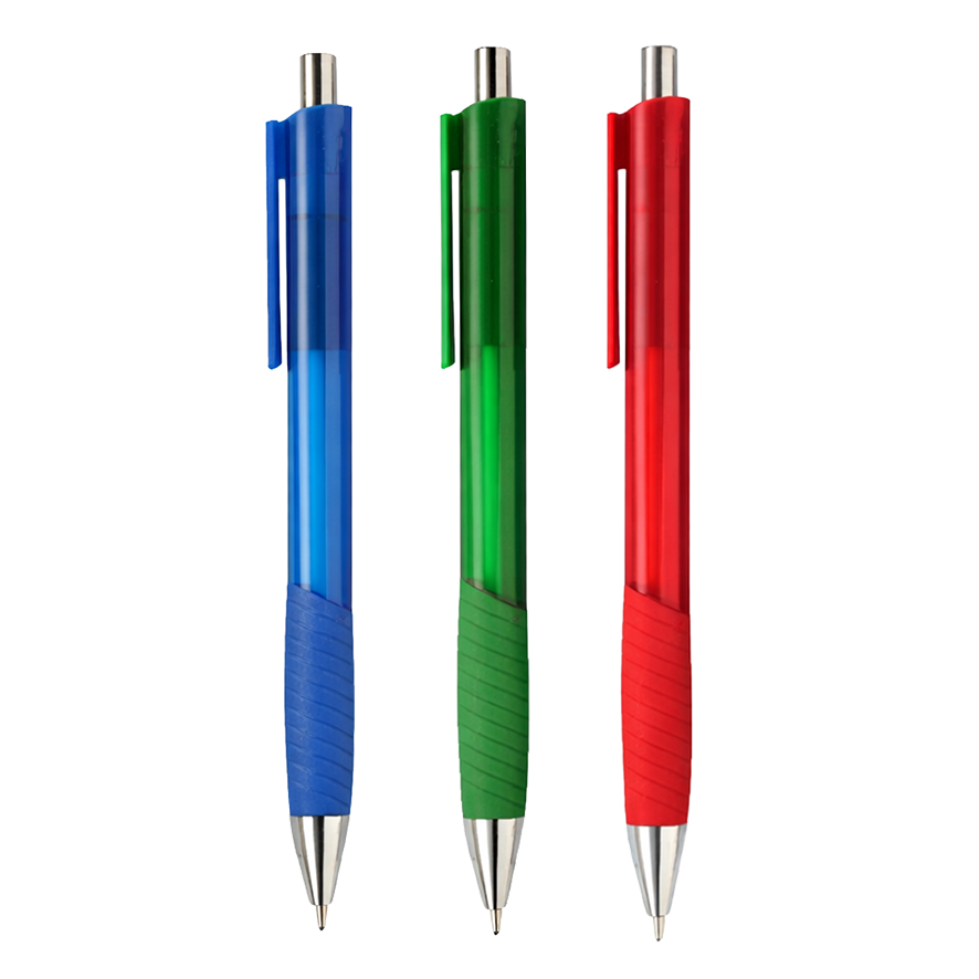 Bolígrafo de plástico cuerpo traslúcido, grip de silicón, botón y punta cromada