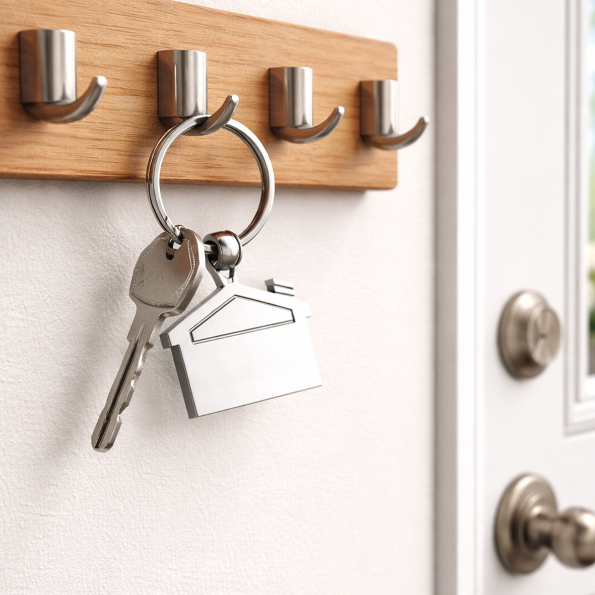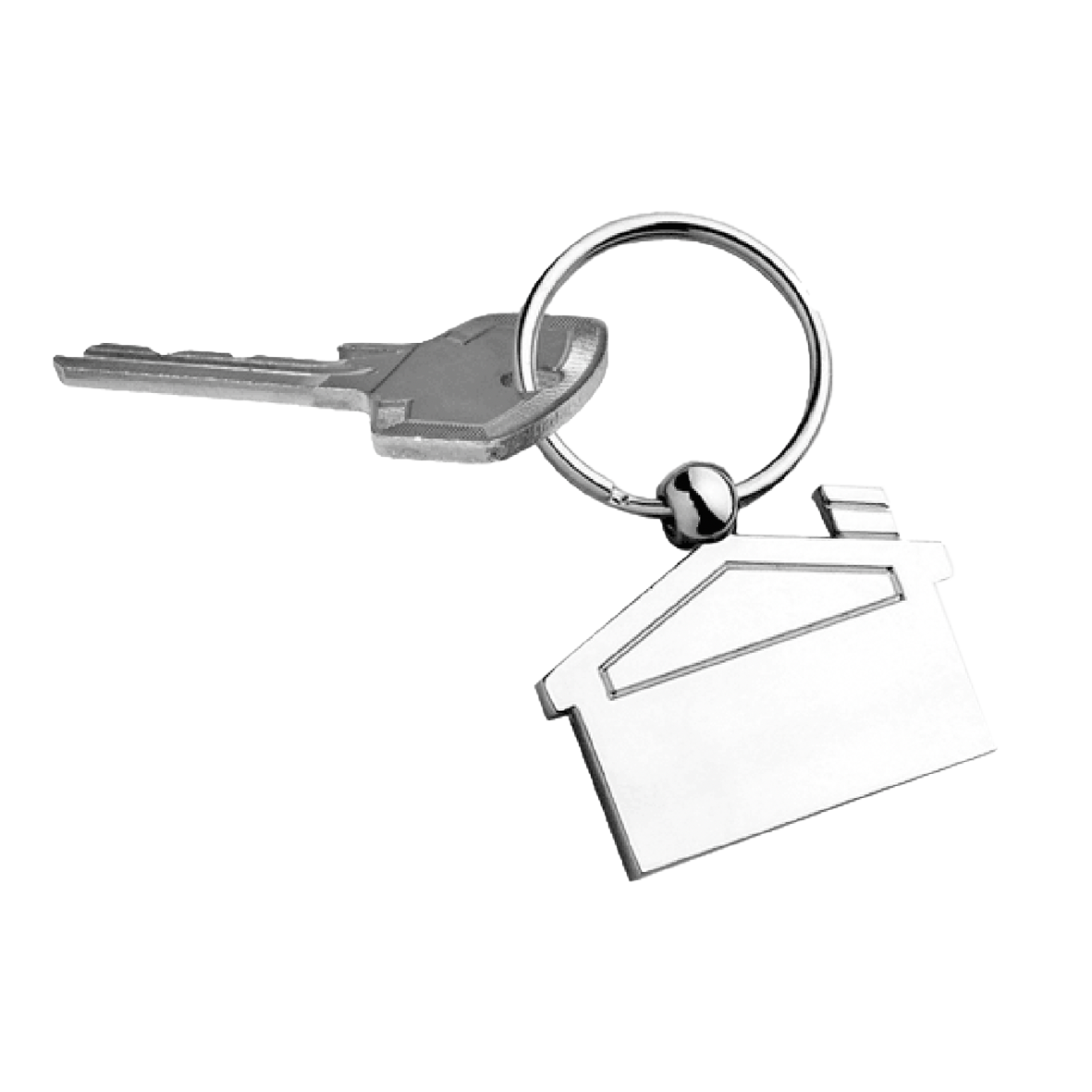 Llavero metálico en forma de casa, elegante y resistente.
