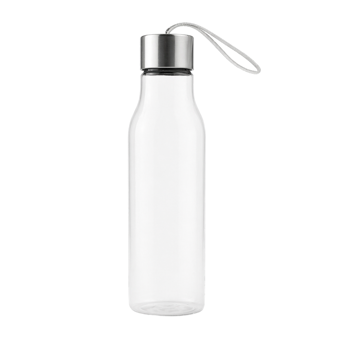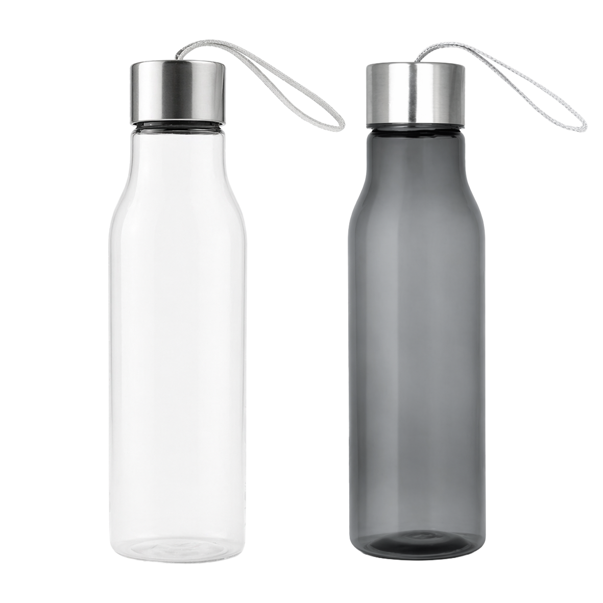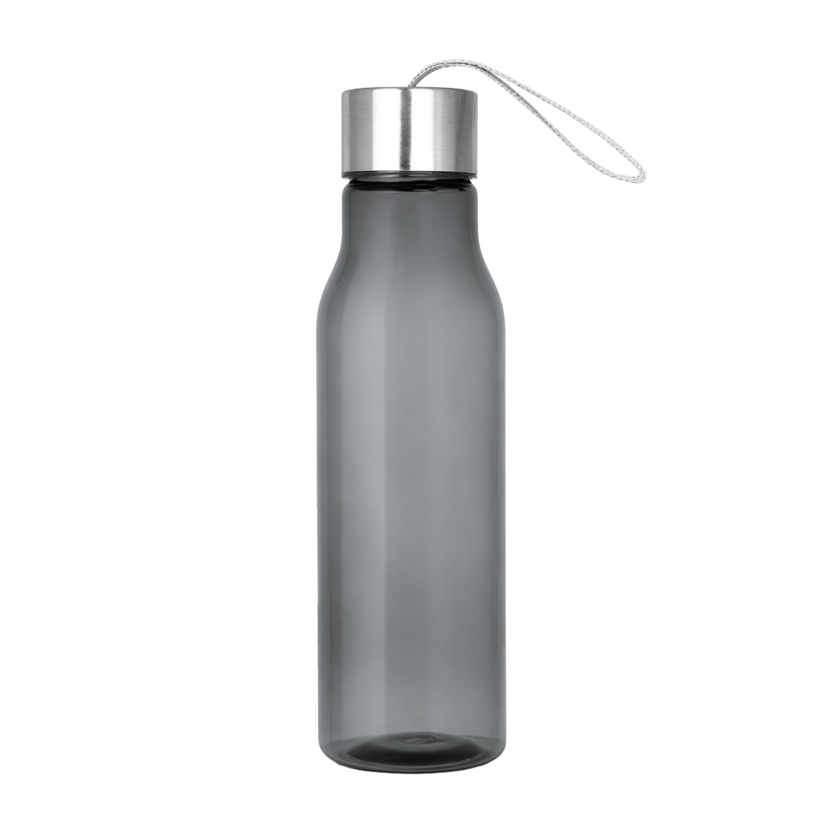 Botella deportiva de plástico translúcido con acabado acrílico con tapa metálica y cordón sujetador.