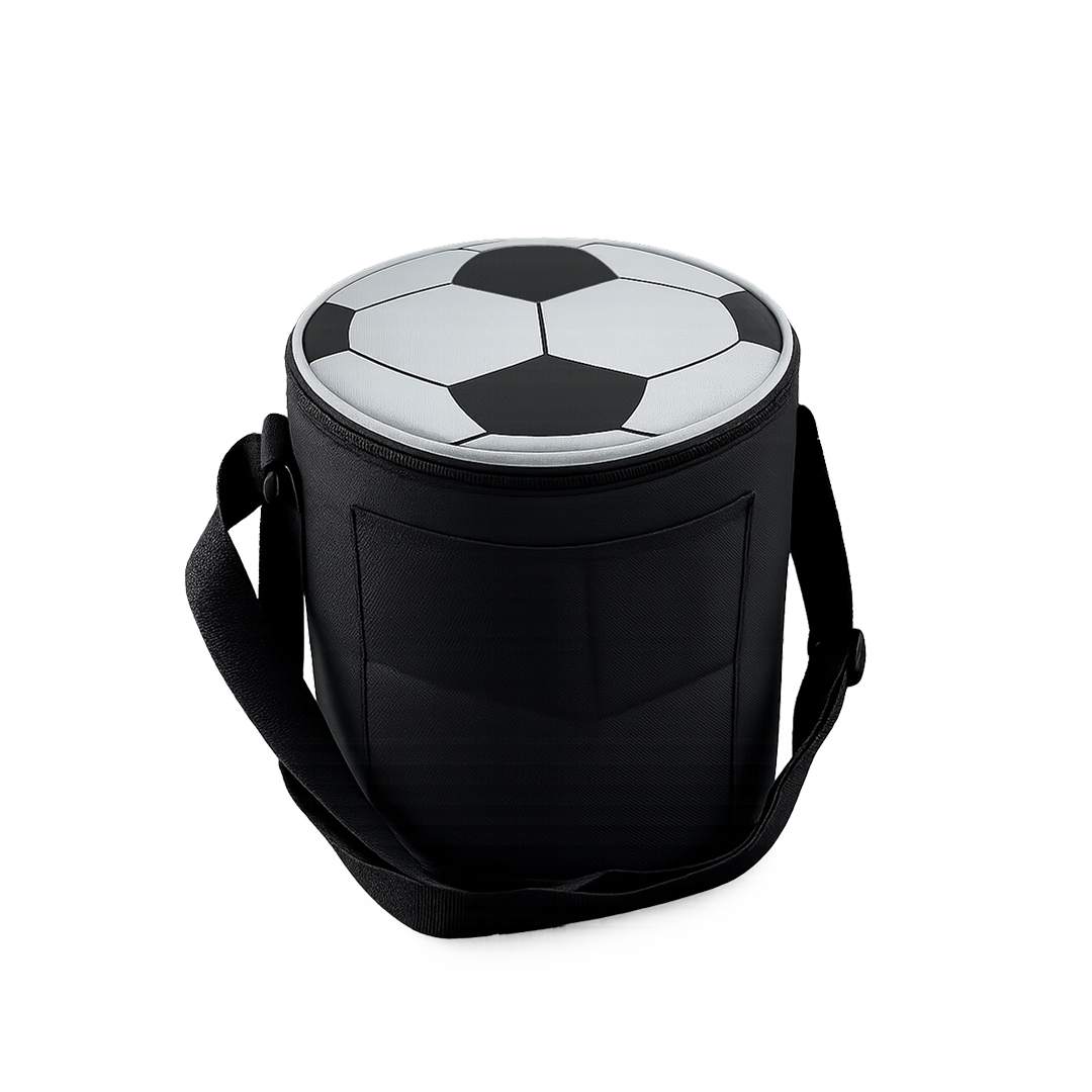 Lonchera térmica cilíndrica con diseño inspirado en balón de fútbol en la tapa.
