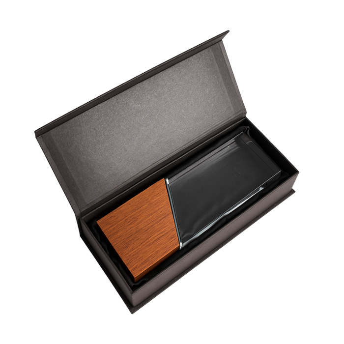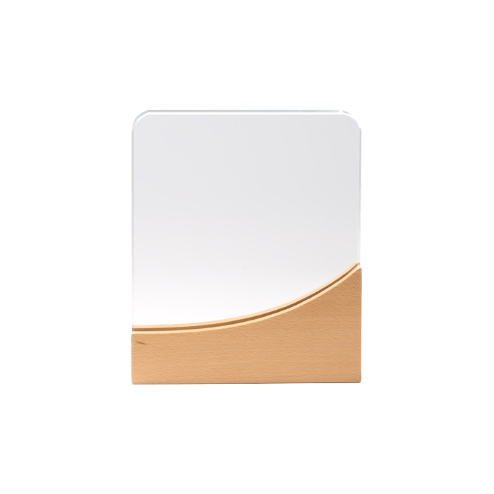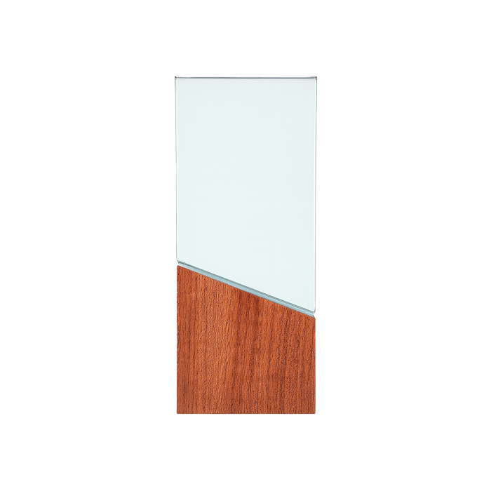 Trofeo de vidrio con base de madera.