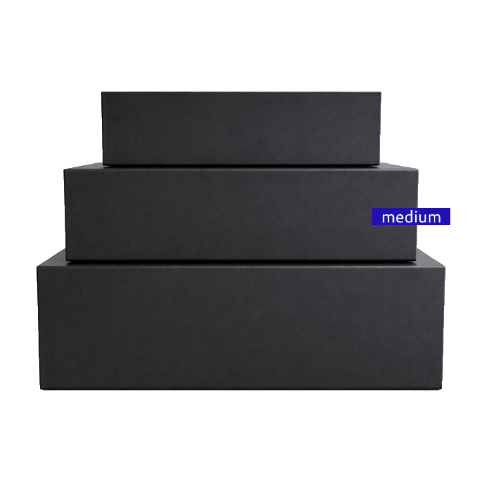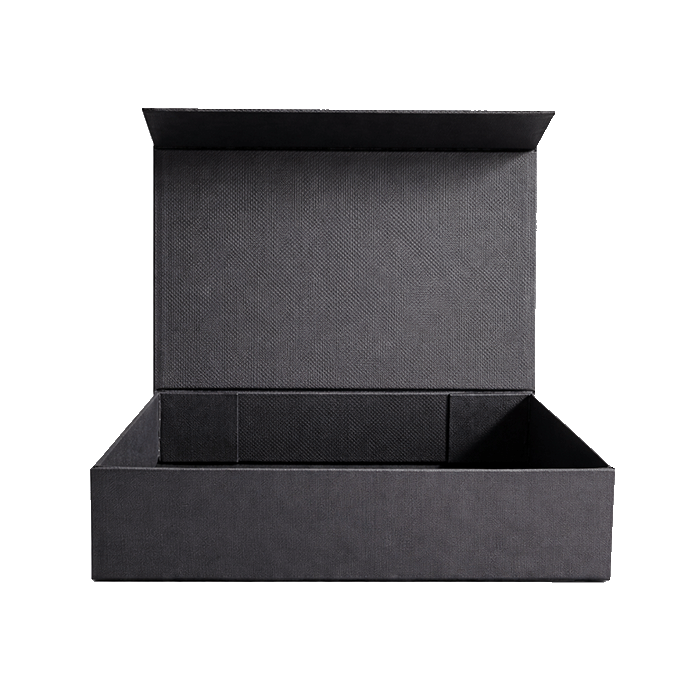 Caja rígida premium con tapa imantada, elaborada en cartón de alta resistencia con acabado negro elegante.