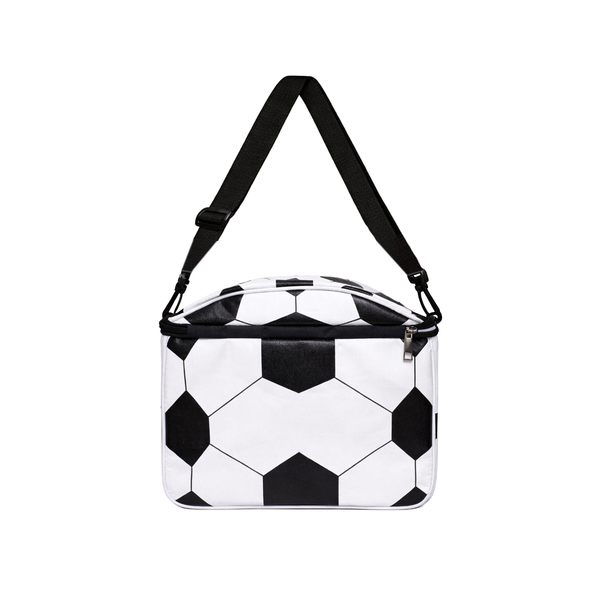 Lonchera térmica con diseño de balón de fútbol. Cuenta con cierre superior, interior aislante y correa ajustable para fácil transporte.